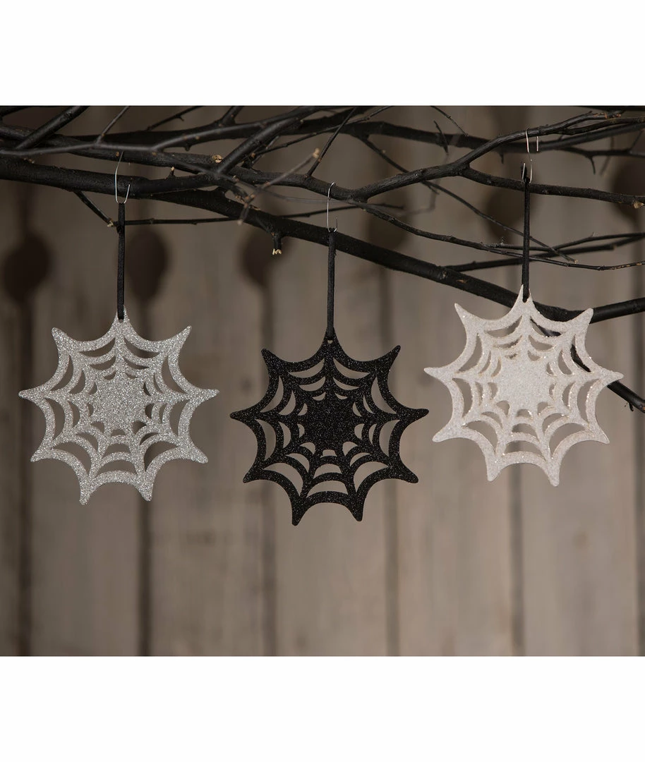 Add a little fright on Halloween night with these silver, black, and white glittered spider web hanging ornaments.
