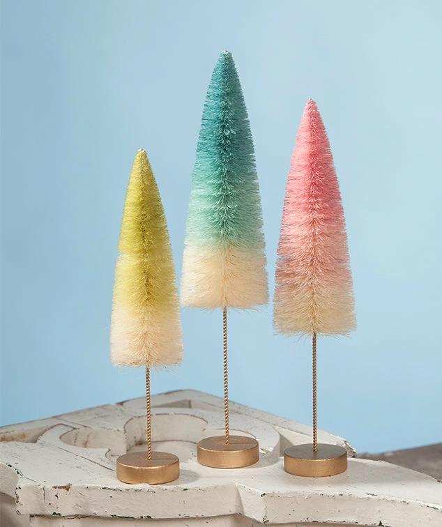 Give your decorating soft pastel color with a chic twist with these Ombre Bottle brush trees in shades of green, blue and pink.