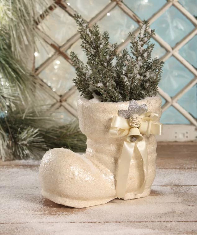 Paper mache Santa boot Christmas display embellished with mica glitter, a bell and ribbon.