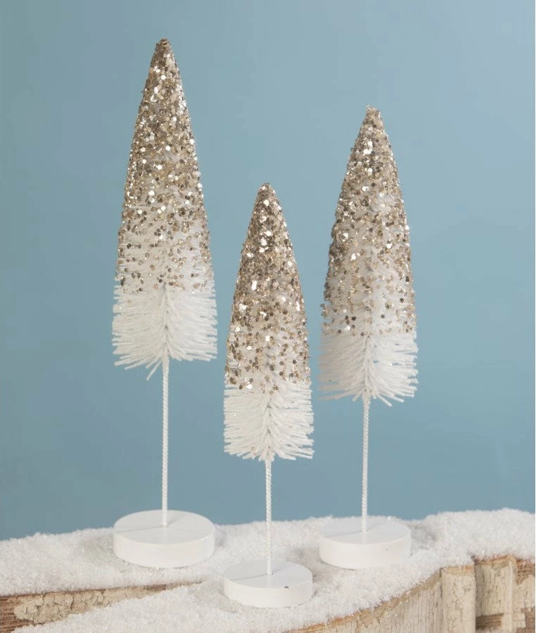 Make your holiday glitter and shine with these White Flocked Bottle Brush Trees with Platinum Glitter.