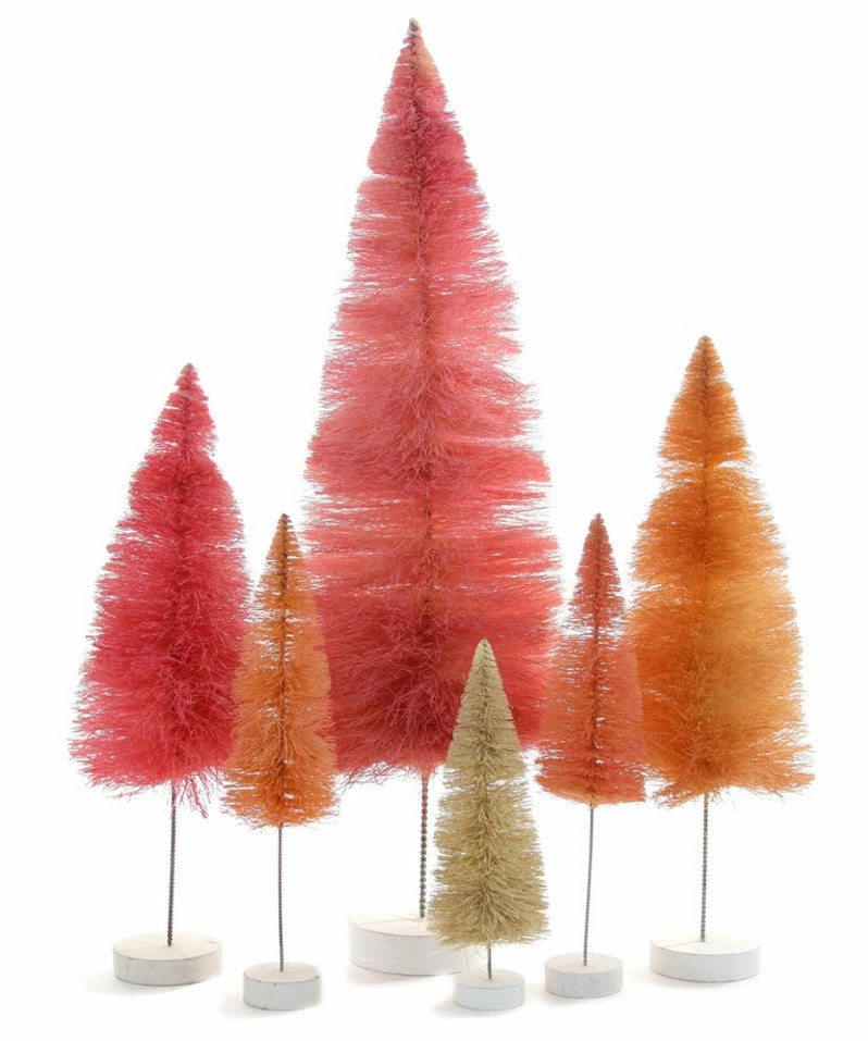 Create a stylish holiday vignette with these textural shades of Pink & Coral Bottle Brush trees that come in various sizes.