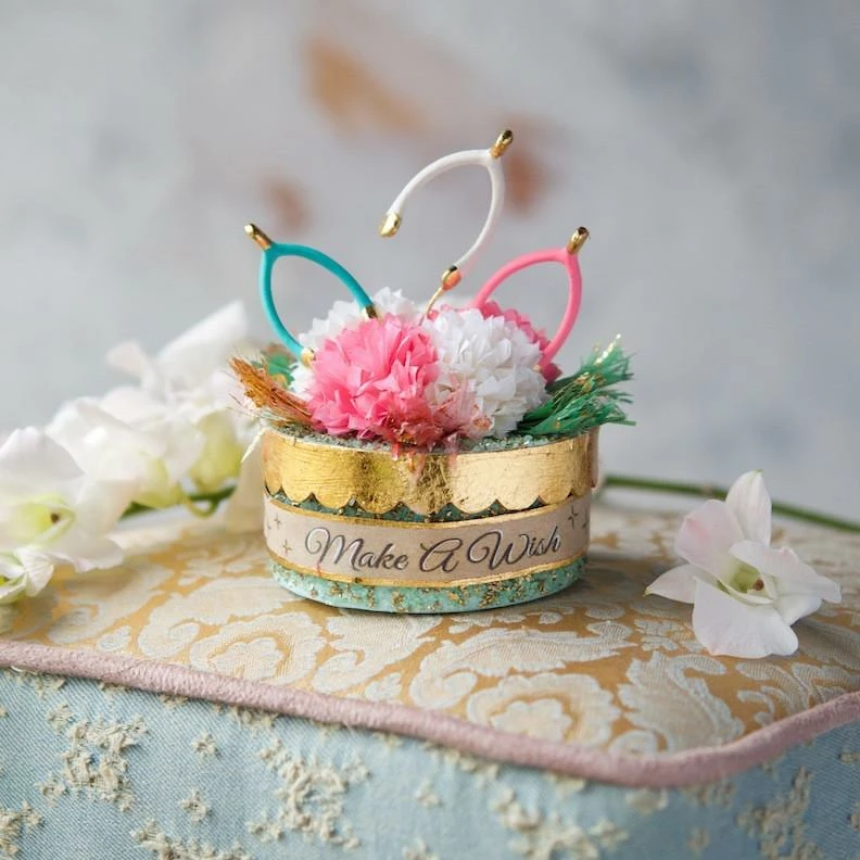 - Decorated with wishbones, chunky glitter and florals