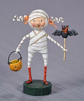 Minnie Mummy is eager to go trick or treating. All bundled up in her mummy costume with bat wand and pumpkin bucket in tow.