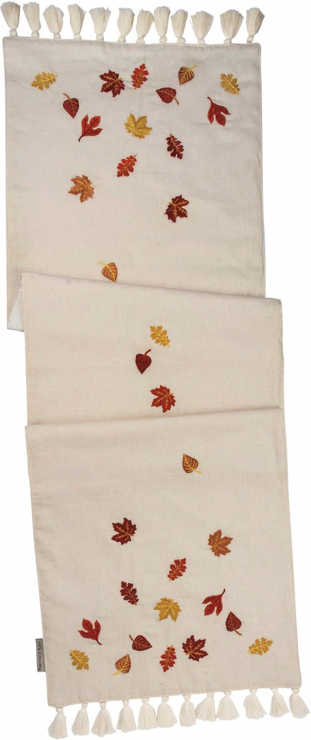 Bring the beauty of autumn to your table with this natural linen table runner embroidered with fall leaves.