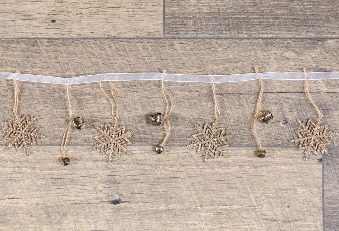 - Glittered snowflakes, real metal jingle bells, natural cord, ribbon