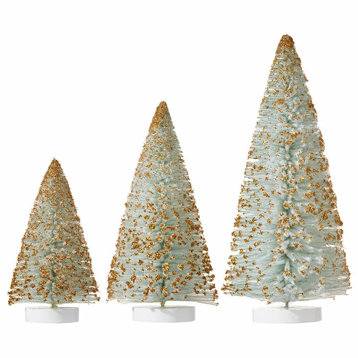 Add a festive backdrop to your Christmas décor with these Flocked Blue-Green Bottle Brush Trees Dusted with Gold Glitter!