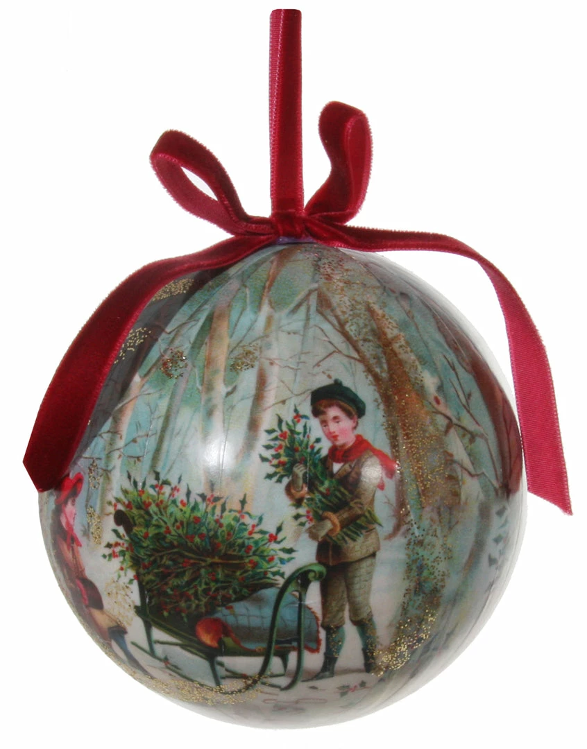 Bring a Victorian touch to your Christmas decor with this decoupage ball ornament with a lovely scene of children gathering holly.
