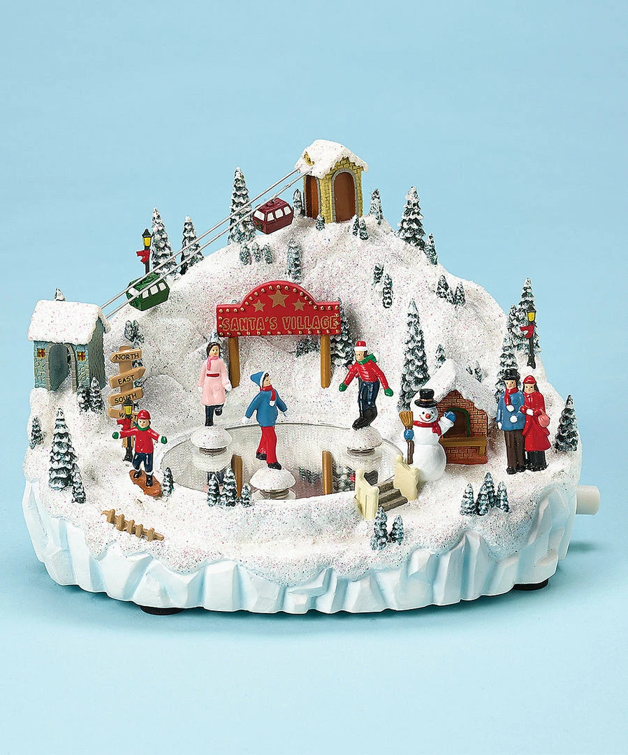Skating Pond Music Box at Santa’s Village. A Snowman and gondola lift complete the Winter scene.