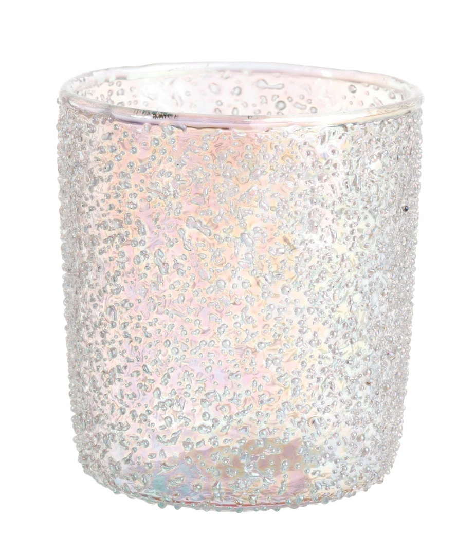 Illuminate your surrounding with a soft glow with these opalescent beaded art glass votive holders by Jim Marvin.